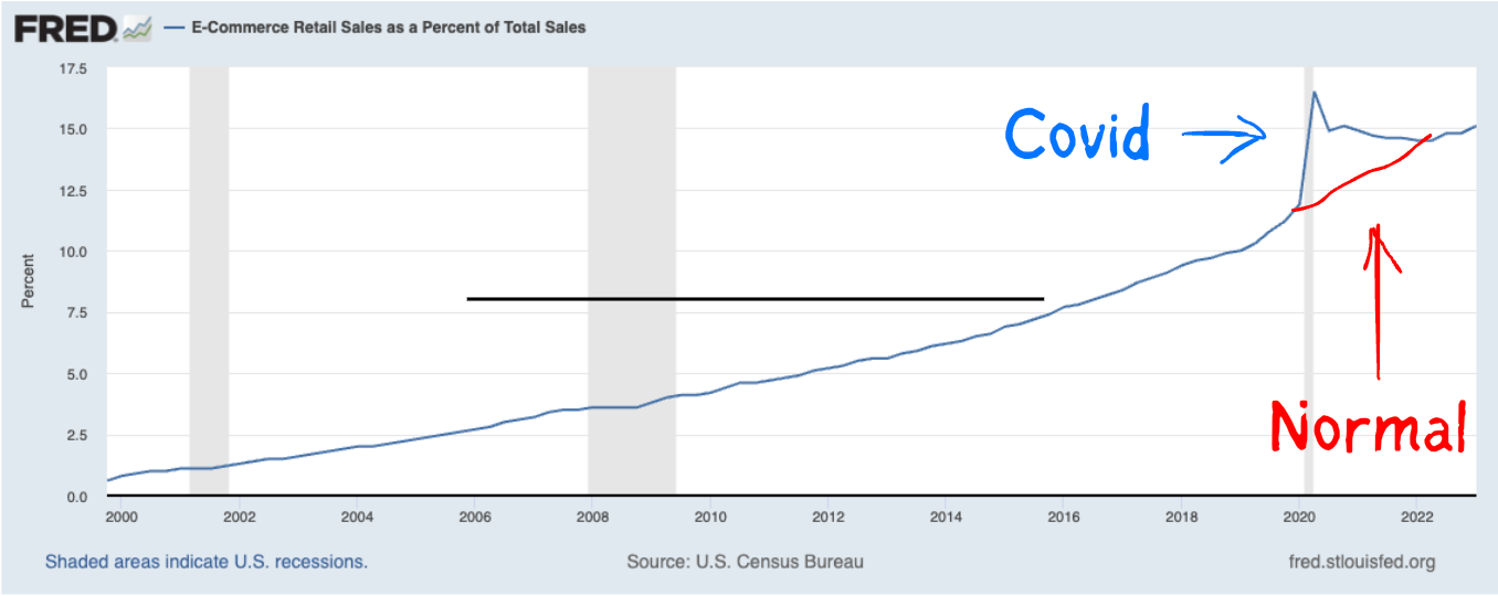Ecommerce is another example of something that people assumed would be changed forever. COVID had unlocked the online world, and we were never going back to normal. But the reality is that change has an almost gravitational force, and its very difficult for anything to make it happen more quickly or more slowly.
