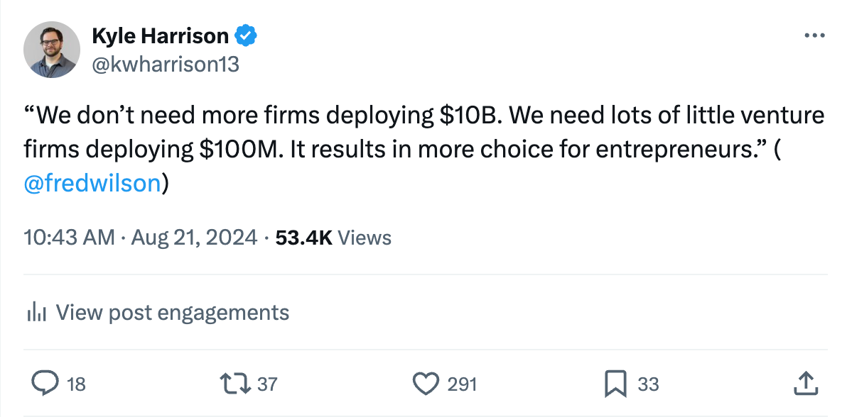 In that piece I quoted Fred Wilson as saying, "We don't need a few firms managing billions of dollars. We need lots of firms managing a few hundred million dollars." When I wrote it, I couldn't remember where I'd heard it from or written about it.