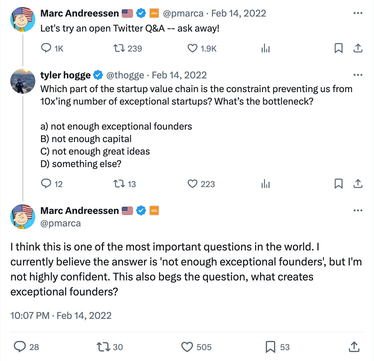Unfortunately, I am not going to author a reality-bending response here to Marc’s question, "what creates exceptional founders?" because I don't know the answer. But its important to not just leave this thought bubble hanging. This is an important question to answer.