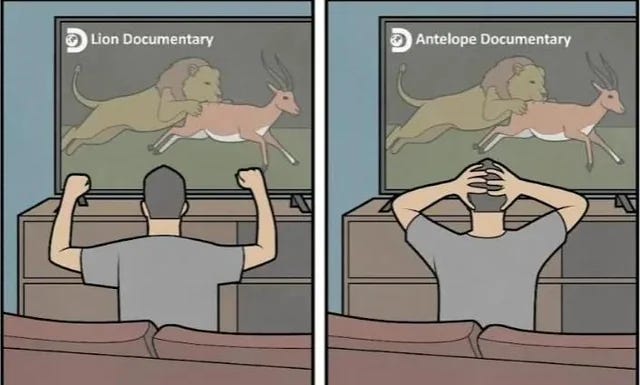 The political side selection has frequently reminded me of this meme. Your reaction to reality depends on what story you think you’re watching.