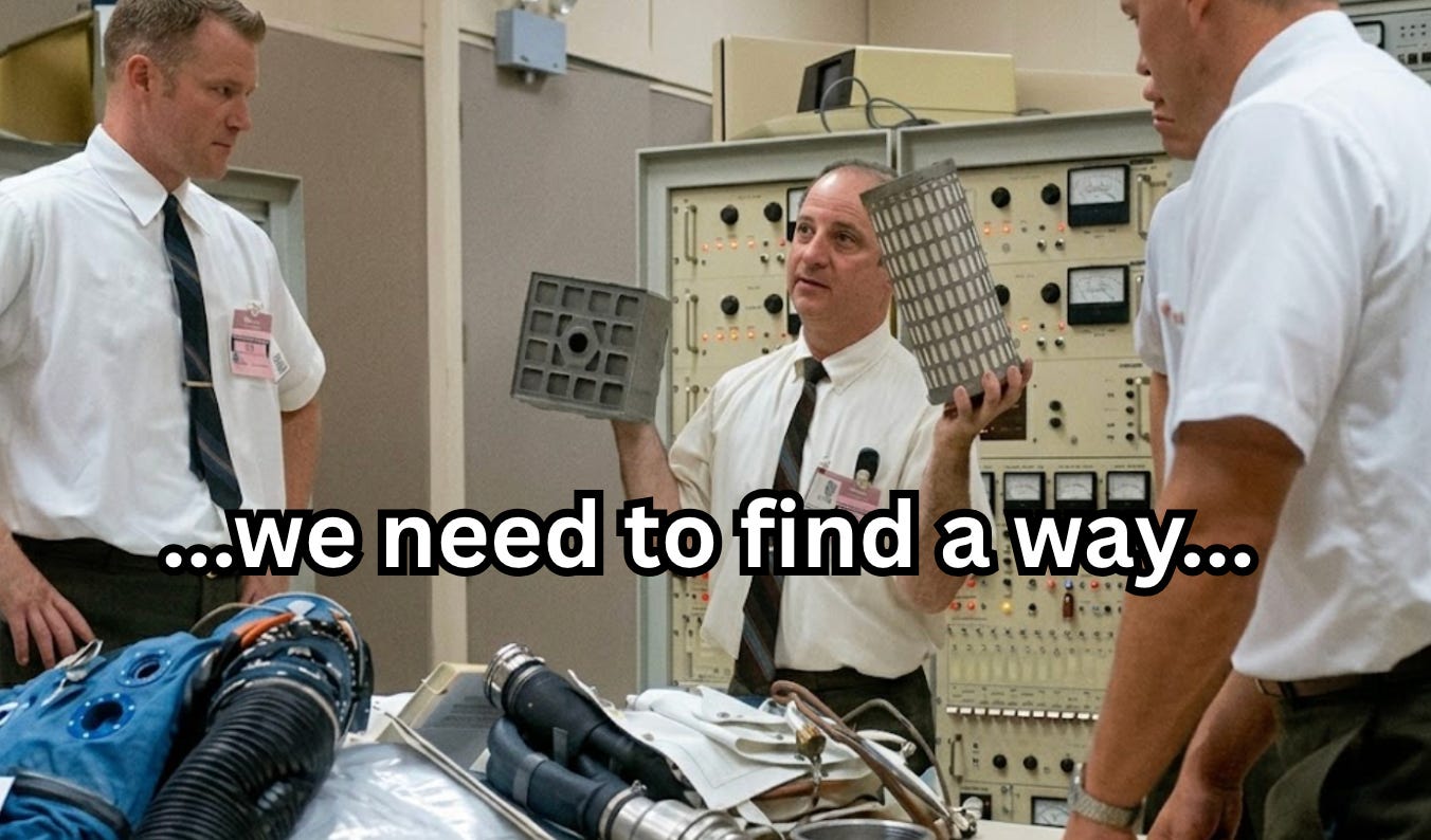 On the Apollo 13 mission, an onboard explosion and mechanical failures meant that the ship’s CO2 filter was malfunctioning and could have killed the astronauts. In the movie, there is a scene where a team at NASA dumps boxes of random items that represent everything the astronauts have onboard, saying “we need to find a way to make this round filter fit in this square hole.”